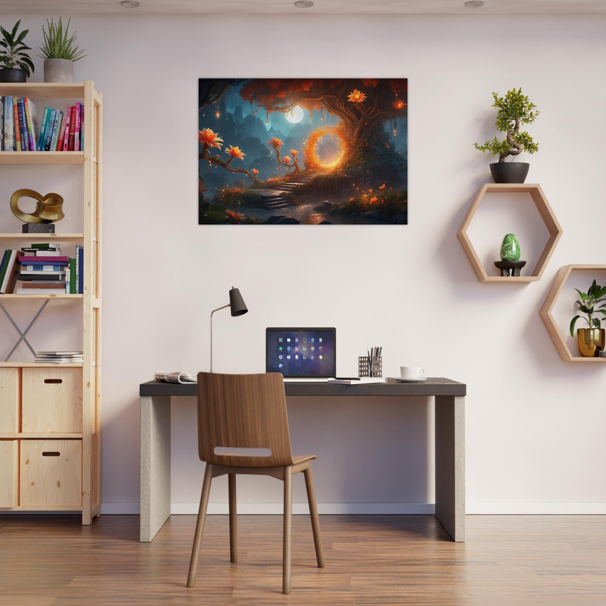 Material: Aluminij DIBOND® – dve plasti belega aluminija s črnim polietilenskim jedrom, lahek, a močan, idealen za večja umetniška dela.